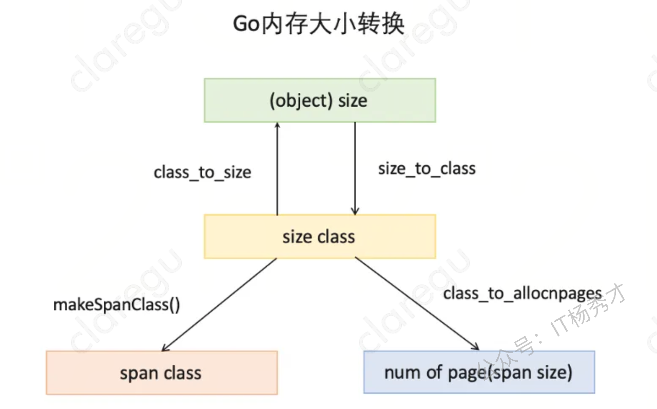 由上表可见最大的对象是32KB大小,超过32KB大小的由特殊的class表示,该class ID为0,每个class只包含一个对象。所以上面只有列出了1-66。 内存大小转换 下面还要三个数组,分别是:class_to_size ,size_to_class 和 class_to_allocnpages3个数组,对应下图上的3个箭头: