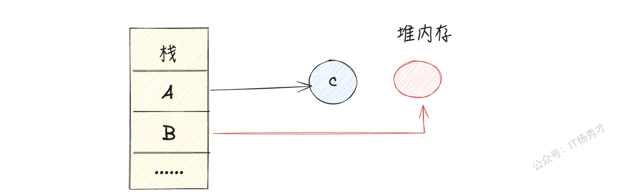 如上图所示,红色1标示的堆内存块就是垃圾内存,需要被回收清理,因为这块内存已经被分配,但是并没被使用,而剩下的两个黑色1标示的堆内存块不能被GC回收,因为还有两个栈上对象指向他们,它们还处于被引用状态中,处于使用阶段,不是垃圾内存。