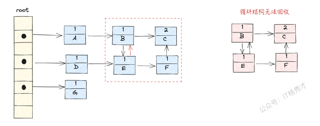 比如上图,再删除了对象A和D之后,由于对象B和E之间存在循环引用,所以上下B,C,E,F四个对象都存再引用关系,计数都不为0,所以都不能被回收,如果大量存在这种循环对象的话,就会造成一定的内存泄漏。