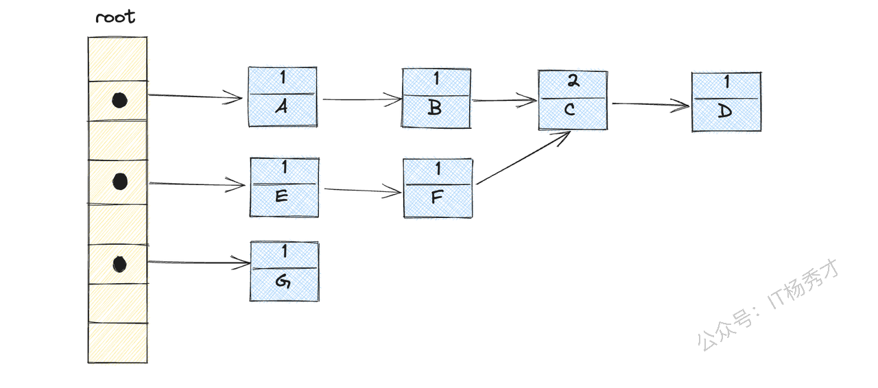 如上图所示,对象C由于有两个对象B,F引用,所以计数为2,其余节点计数都是1。