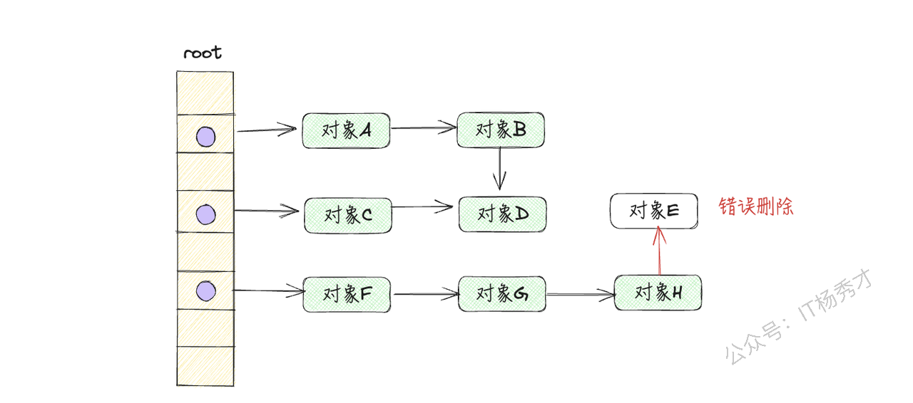 我们在手动free对象的时候,根据当前程序链路A-->C-->D-->E,依次free对象,当free掉D,E对象之后,只剩下C对象,貌似没有问题,但是其实还有其他的对象B引用了D对象,这样就造成了悬挂指针问题。
