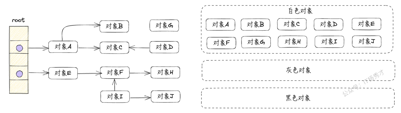 扫描根对象:从根对象开始扫描,将所有可达对象标记为灰色,并放入待处理集合中