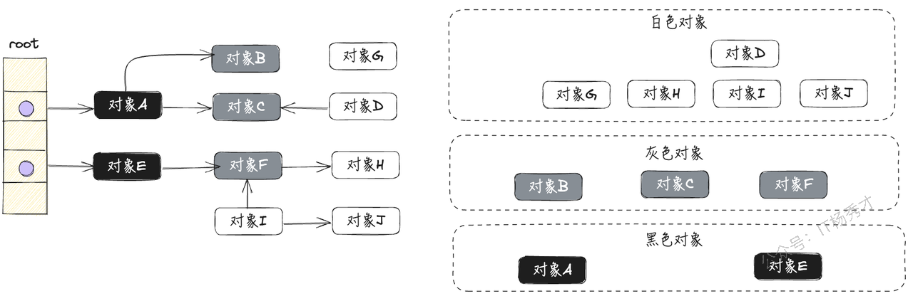 处理灰色对象:从待处理集合中取出灰色对象,将它们引用的对象标记为灰色,并将这些新标记的对象加入待处理集合中,同时将自身标记为黑色