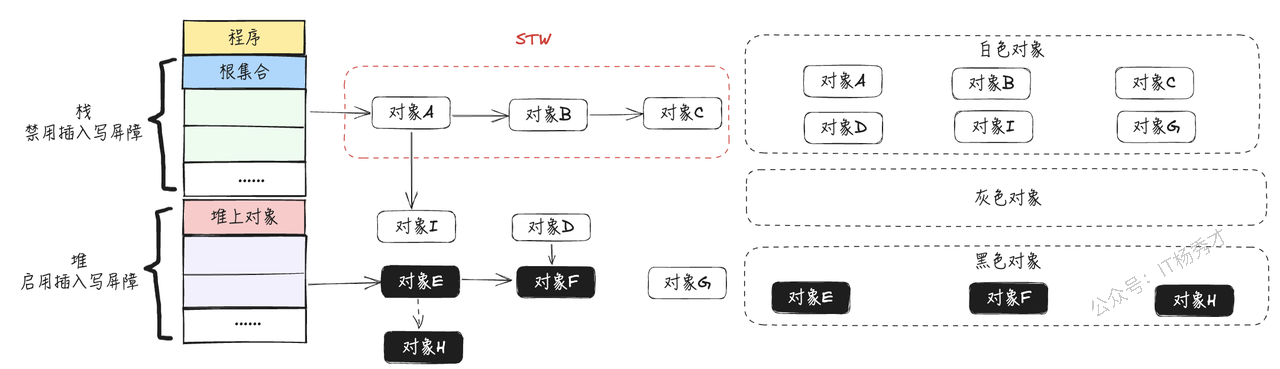 GC 开始将栈上的对象全部扫描并标记为黑色(注意是一个一个栈标记,不是所有栈全部暂停标记)