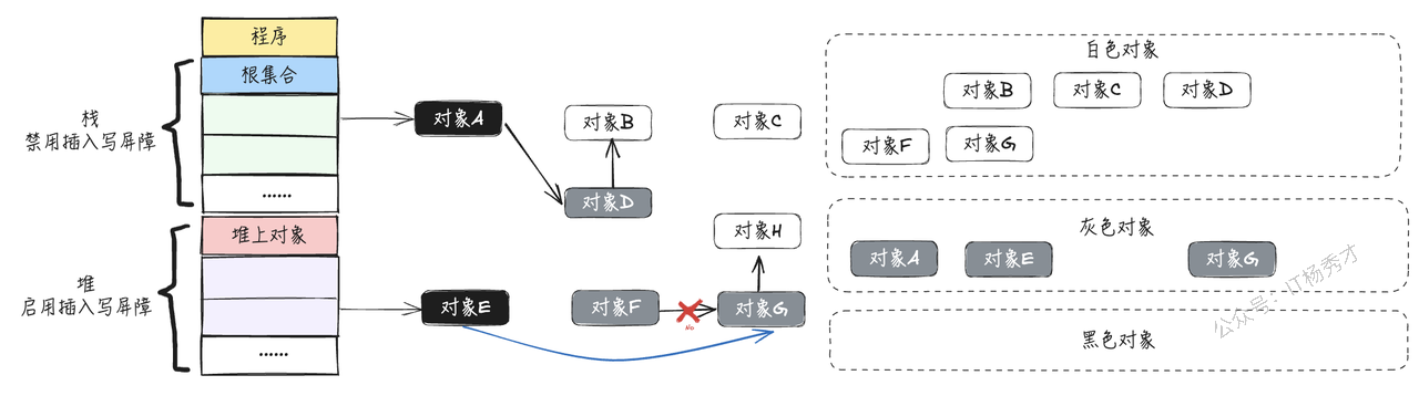 按照三色标记法和混合写屏障的的步骤继续往下执行,最终得到的结果如下图所示,下图有误,对象F已经删除对对象H的引用,H会标记为黑色,等待下一次GC回收: