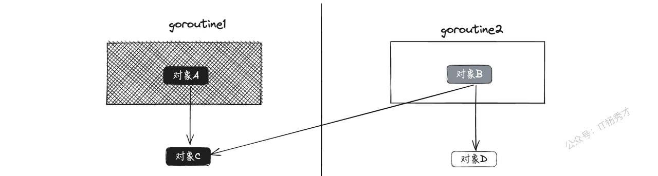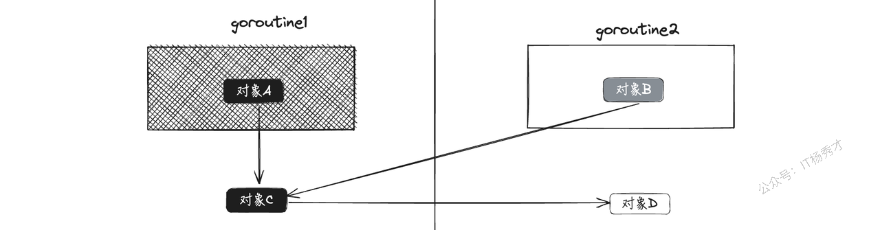 对象A是 goroutine1 里栈上的一个对象,goroutine1里的栈空间已经扫描完了,并且 对象C 也扫描完标记为黑色的对象;