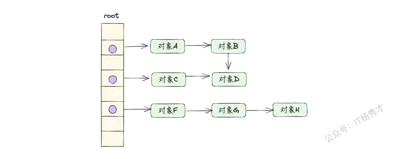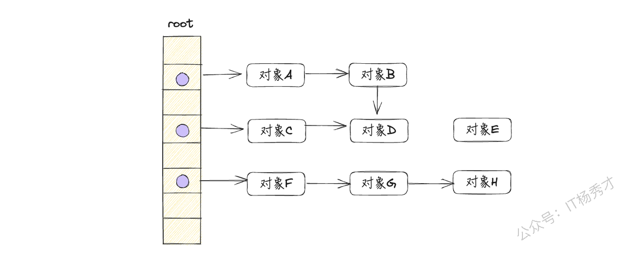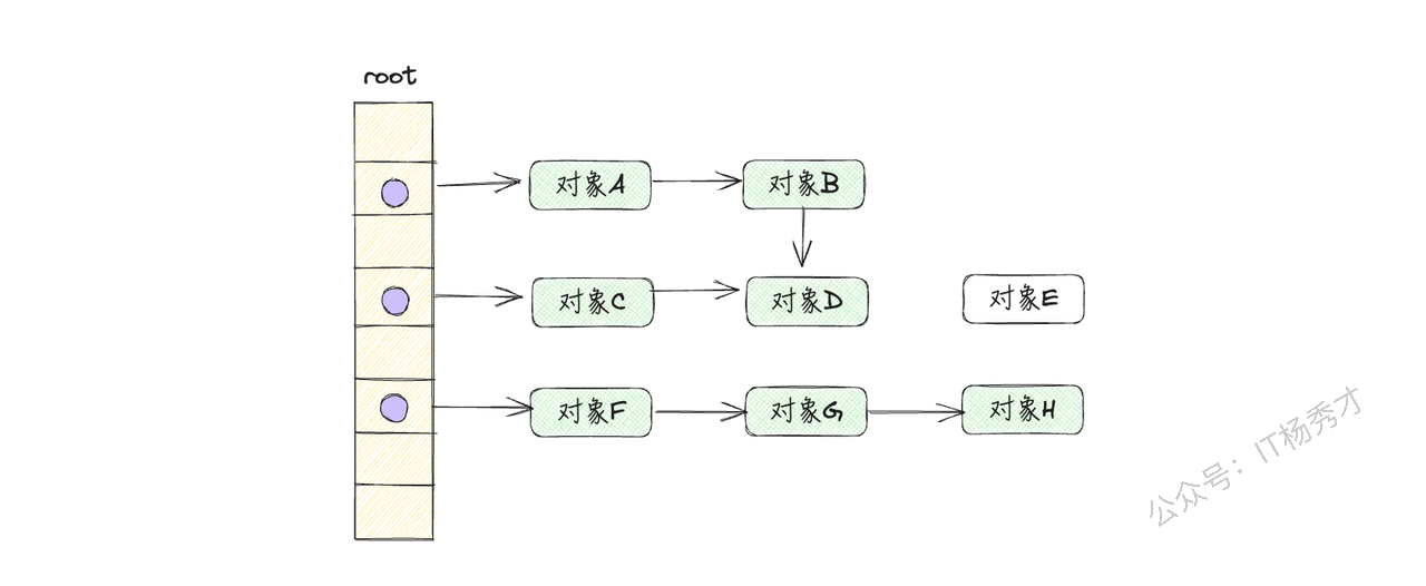 可达对象:对象A、对象B、对象C、对象D、对象F、对象G、对H