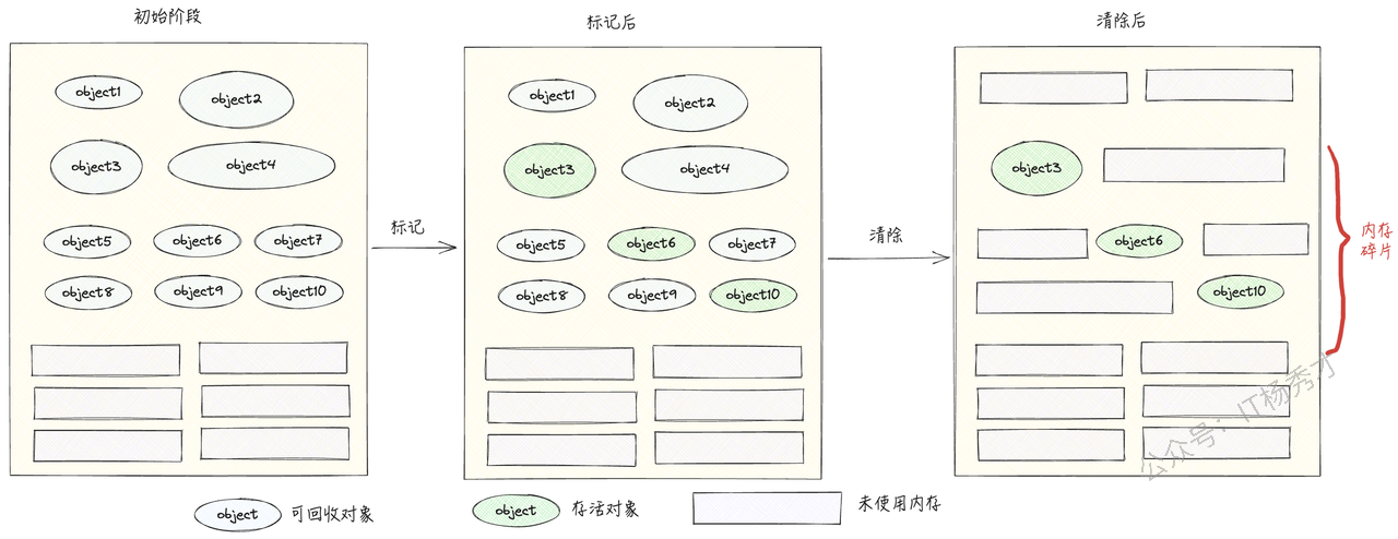 遍历堆上的所有对象,回收没有被标记的不可达对象,如下图所示: